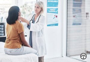 Consulting, thyroid and woman with doctor in hospital for sick, cancer or medical test. Healthcare, medicine and virus with physician and checking throat of patient in clinic for emergency and injury.